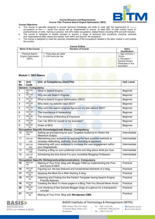 This document outlines the course structure and requirements for a Practical Search Engine Optimization (SEO) course. The 3-day per week course aims to provide technical SEO skills for ITES sector occupations. It covers 5 modules: SEO Basics, Keyword/Market Research, On-Page Optimization, Content Optimization, and Off-Page Optimization. Each module contains generic compulsory units, occupation-specific theory units, and practical skill units. Students will learn SEO strategies like keyword research, on-page optimization of titles/meta tags, content writing, and off-page activities like link building, social bookmarking and guest blogging. The course is designed to enable students to implement SEO best practices and acquire skills needed