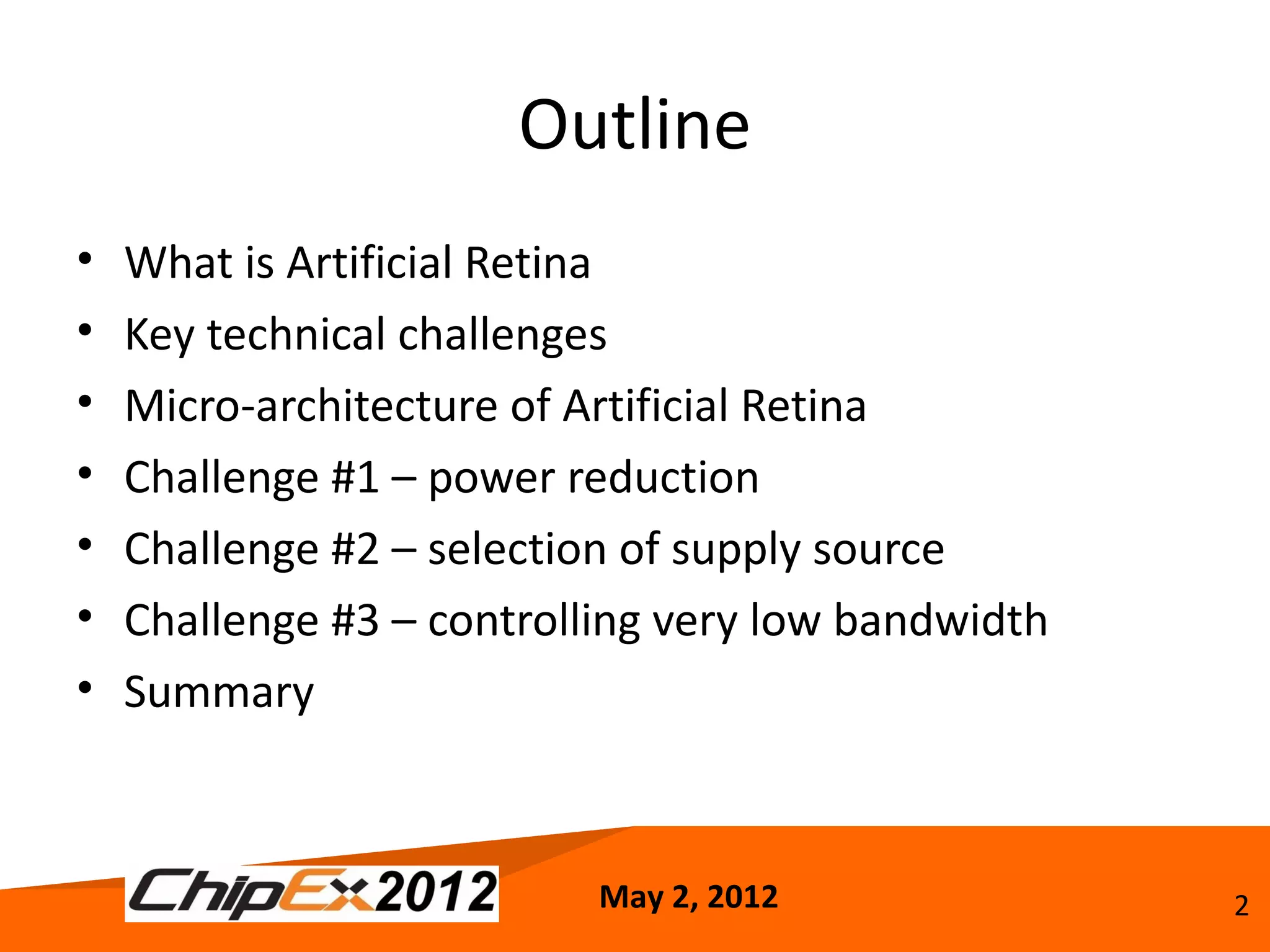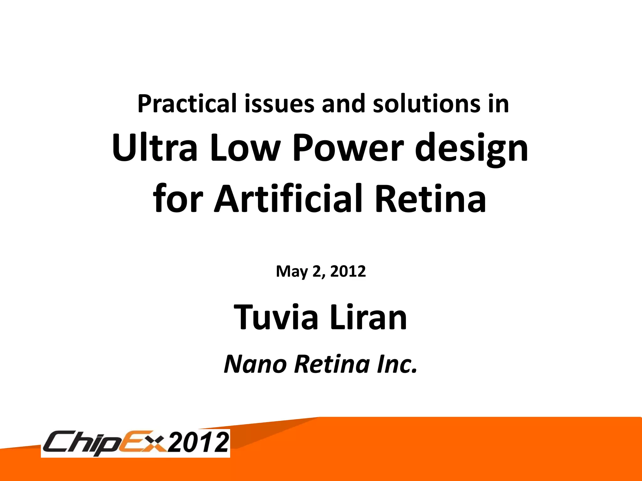 The document discusses the technical challenges in developing an artificial retina, including achieving ultra-low power consumption of under 300uW. Key challenges include operating circuits in the sub-threshold voltage region, selecting an appropriate low-voltage power source like photovoltaics, and implementing very high resistances and low bandwidths below 100Hz needed for neural interfaces. Addressing these challenges requires specialized microarchitectures, circuit techniques like switched capacitor implementations, and modeling focused on sub-threshold and mismatch effects.