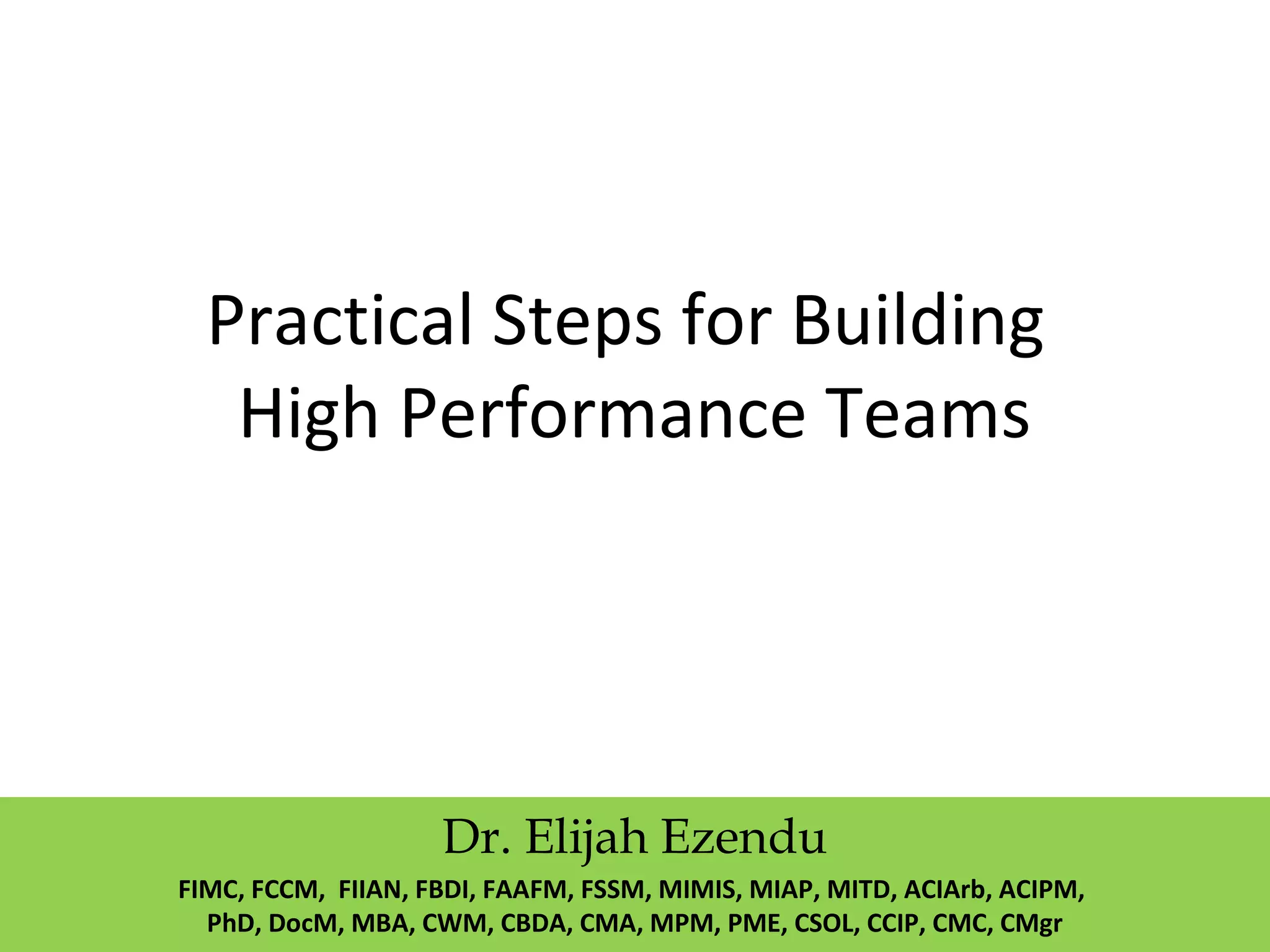The document provides information on building high performance teams. It discusses developing a team charter that defines the team's mission, objectives, timeline and responsibilities. It also identifies the key qualities of high performance teams such as clear goals, collaboration, excellence and leadership. When selecting team members, the document recommends considering criteria like creativity, team skills, respect and balancing qualifications with commitment to the team.