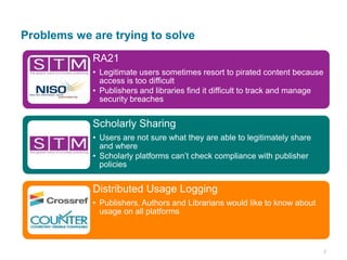 The RA21 initiative aims to address the challenges of access to scholarly content in the digital age, moving beyond traditional IP address recognition towards a more user-friendly and efficient authentication system. It recognizes the need for seamless resource access for users across multiple devices and locations, while also tackling issues of piracy and ensuring compliance with varying publisher policies. The initiative seeks to test new strategies through pilot programs involving various stakeholders to develop best practices for resource access in the 21st century.