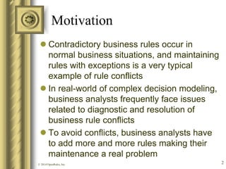 This document discusses techniques for resolving conflicts among business rules. It begins by providing examples of rule conflicts that commonly occur in business situations. It then discusses how traditional and modern business rule management systems represent rules with conflicts. Specifically, it covers the use of decision tables and defeasible logic, an approach that differentiates between strict and defeasible rules. It also discusses how two open-source business rule engines, Drools and OpenRules, have implemented defeasible logic to enable automatic resolution of rule conflicts.