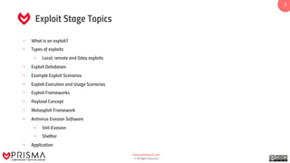 The document provides a comprehensive overview of exploitation techniques in cybersecurity, including types of exploits, exploit databases, and the usage of tools like the Metasploit framework. It covers various concepts such as payloads, exploit editing, and antivirus evasion strategies, while offering practical demonstrations for training purposes. Key features and commands related to Metasploit are detailed, aimed at equipping users with the knowledge to perform ethical hacking.