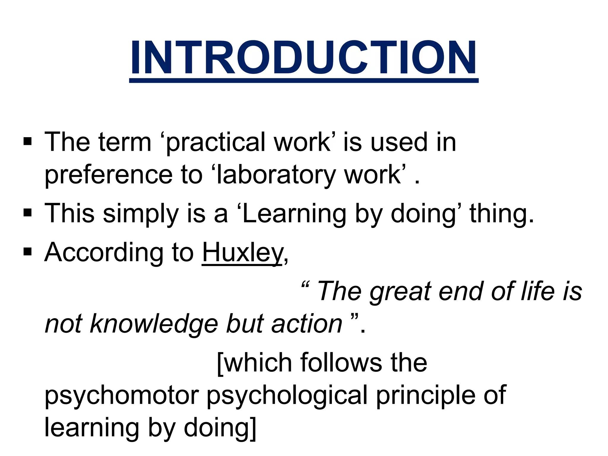Practical work in science refers to hands-on activities like procedures, techniques, and fieldwork that help students develop practical skills and understanding of scientific concepts. It is important for students to learn by doing through practical work as it helps cement their knowledge, develop problem-solving abilities, and sparks interest in science. Organizing practical work effectively involves having students work individually and in small groups, with clear instructions and an emphasis on accurate recording and examination of results.
