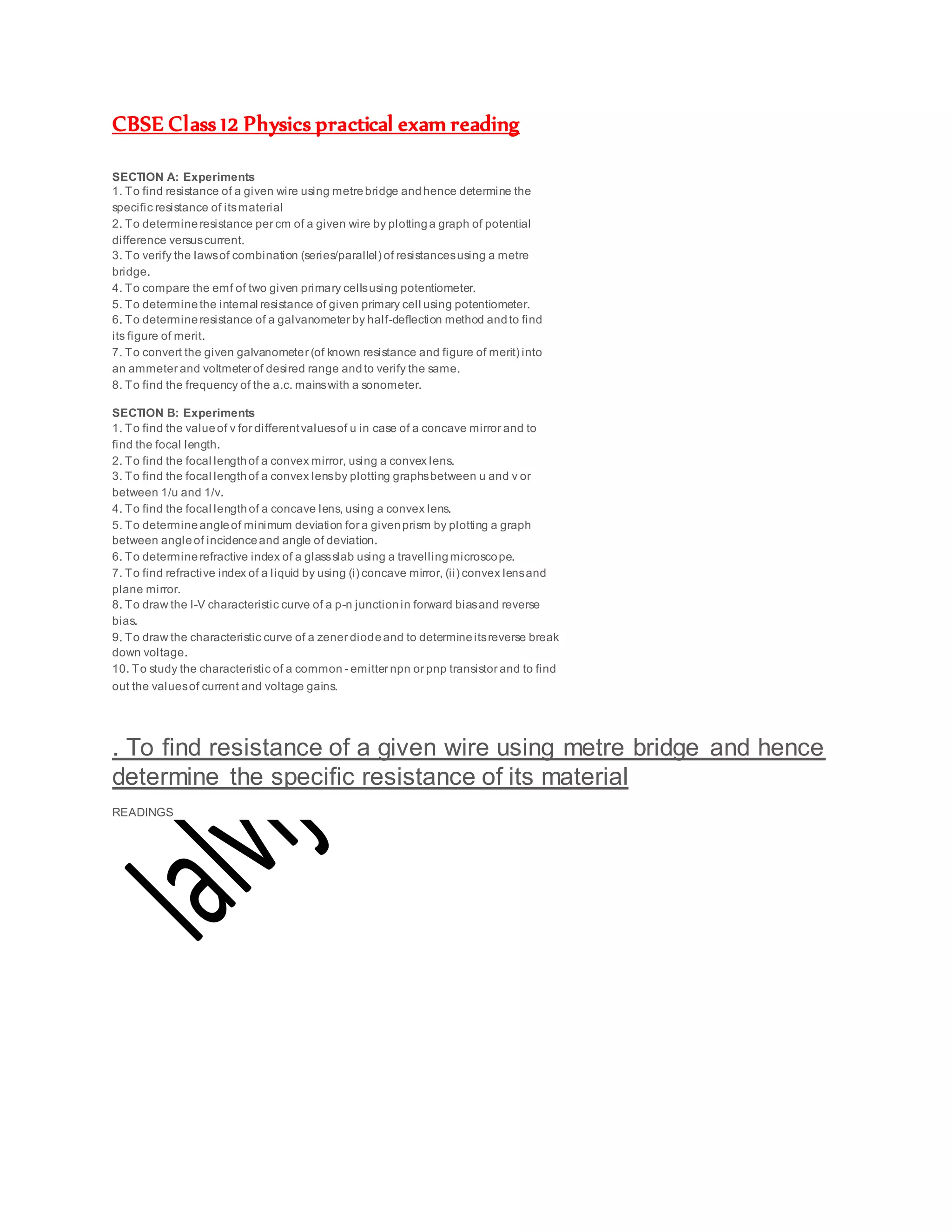 The document outlines experiments for a CBSE Class 12 Physics practical exam, including: