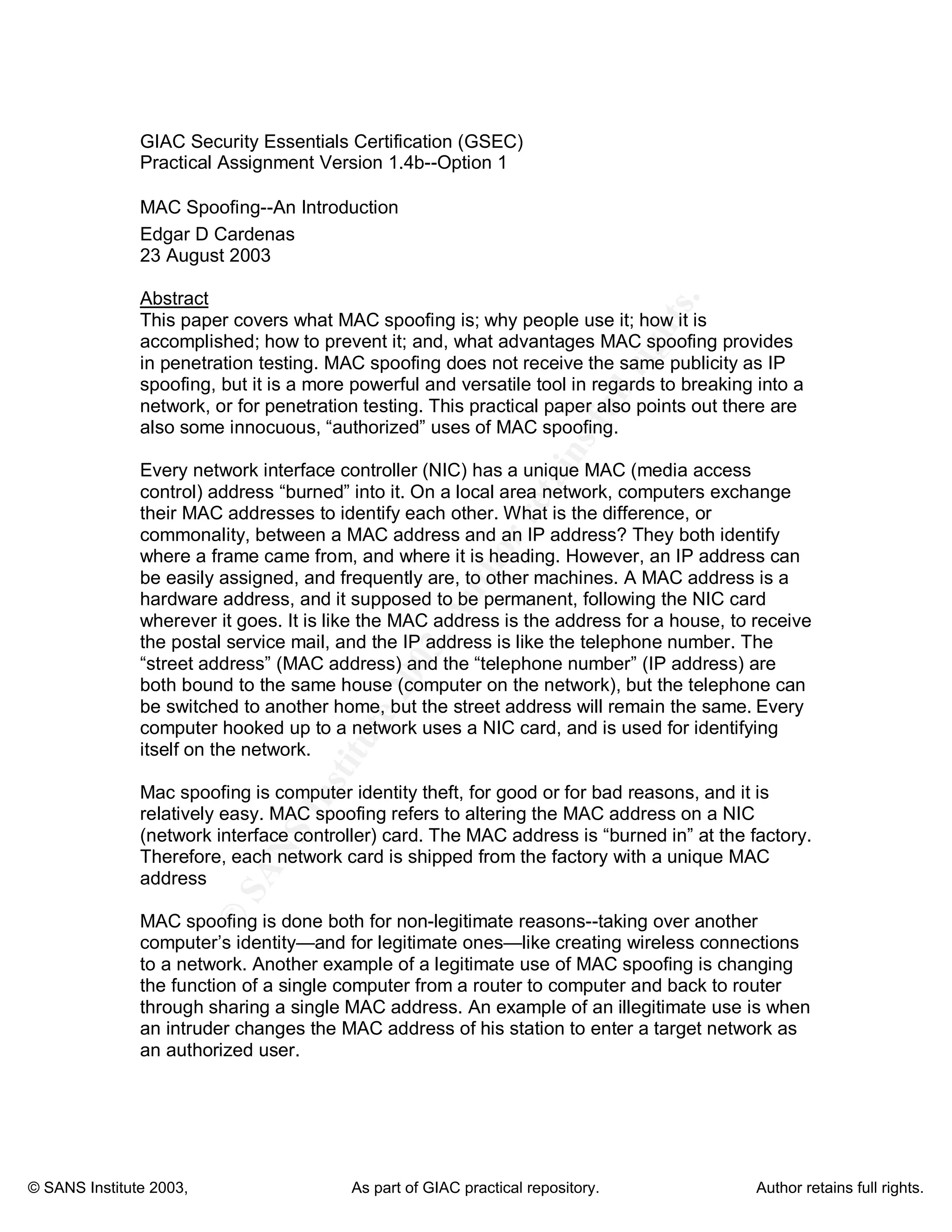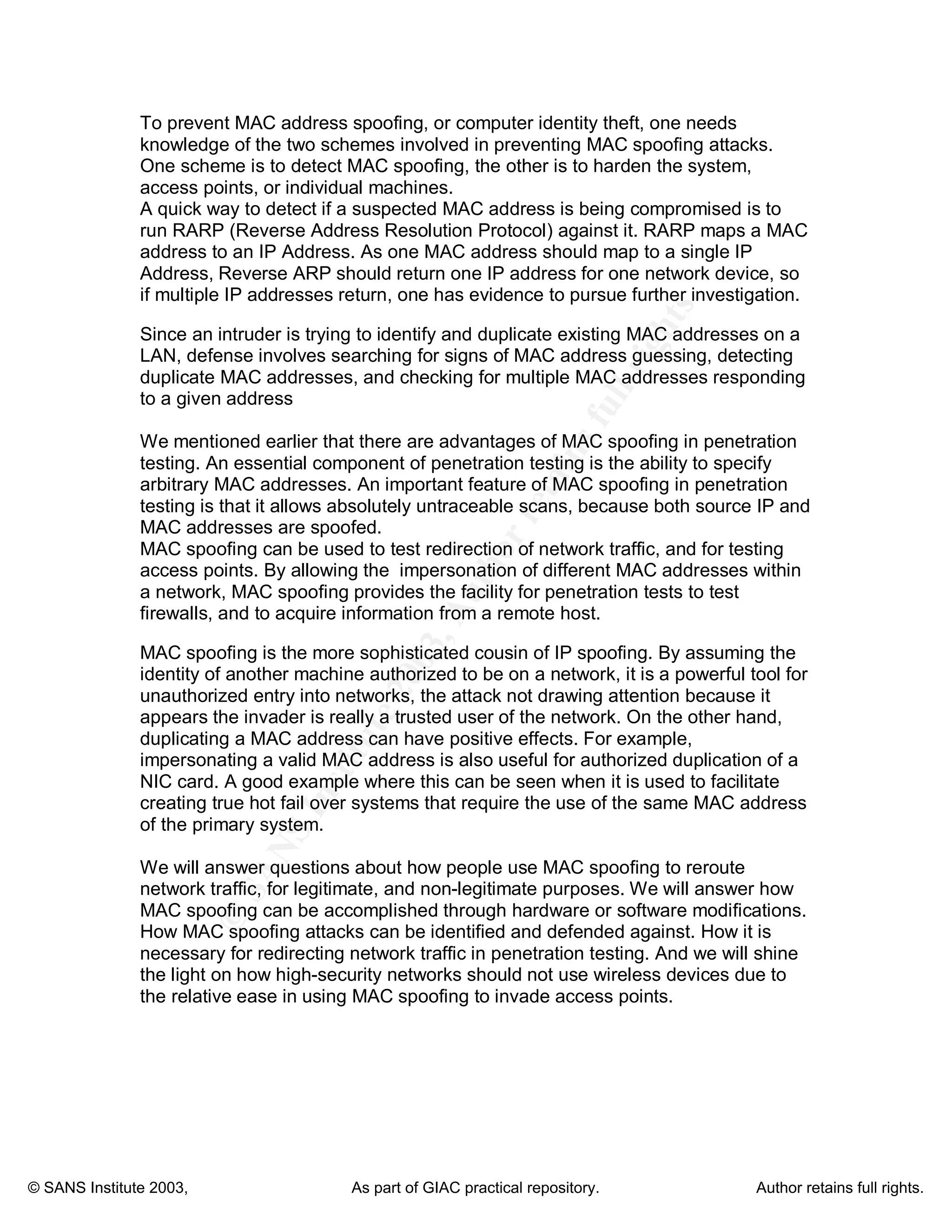 MAC spoofing is the act of altering the media access control (MAC) address of a network interface to disguise a machine's identity. The document discusses how MAC spoofing works, why people use it, how to prevent it, and its advantages for penetration testing. It notes that while less publicized than IP spoofing, MAC spoofing provides a powerful and versatile tool for breaking into networks or penetration testing due to the ability to bypass MAC address filtering and impersonate other devices.