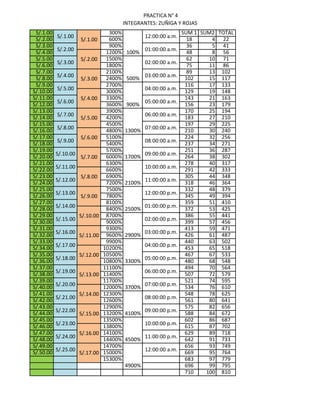 The document appears to be a report or experiment results from students named Zuñiga and Rojas. It contains a table with hourly time periods listed down the left side. The table shows increasing monetary amounts in columns with corresponding interest rates. It tracks sums of two calculated columns at each time period.