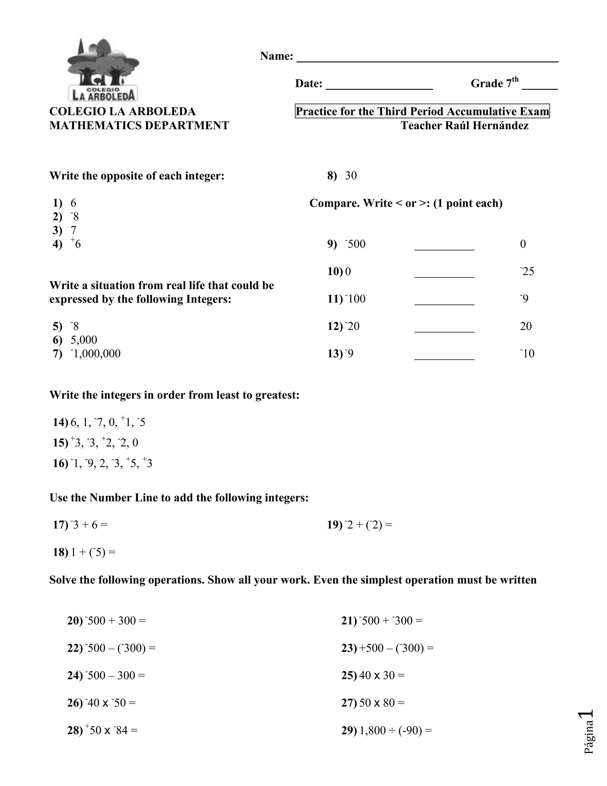 This document provides a practice exam for 7th grade mathematics. It contains 50 questions covering various math topics like integers, number lines, operations, factoring, fractions, least common multiples, and word problems. The exam reviews writing opposites of integers, comparing integers, writing real-life situations as integers, ordering integers, adding and subtracting integers on a number line, solving integer operations, factoring numbers, finding greatest common factors, changing between improper fractions and mixed numbers, finding least common multiples, and solving word problems.