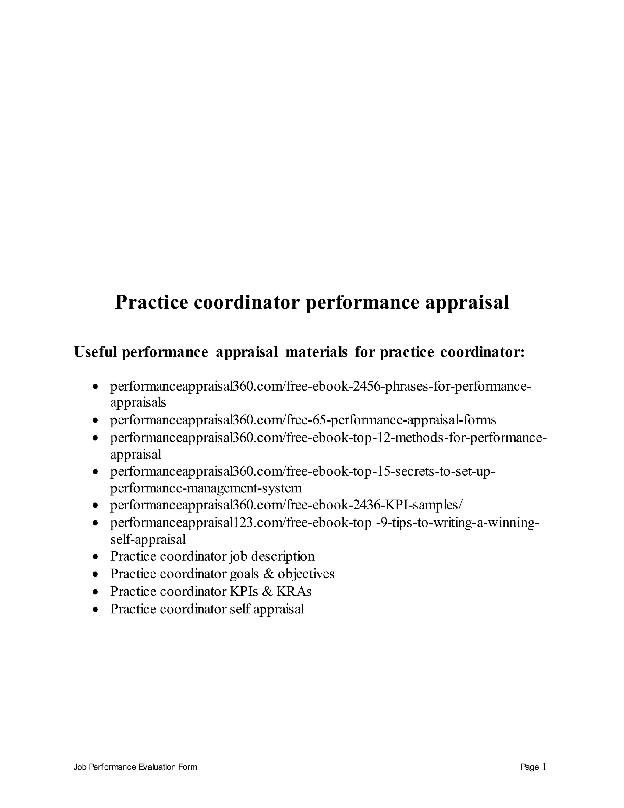 This document provides information and resources for conducting a job performance evaluation of a practice coordinator. It includes a sample performance evaluation form with sections for reviewing performance factors, employee strengths and accomplishments, areas for improvement, and a performance improvement plan. The form also has sections for employee, evaluator, and reviewer signatures. The document then lists additional performance appraisal methods and phrases that can be used to evaluate a practice coordinator's performance, including management by objectives, critical incident, behaviorally anchored rating scales, and 360-degree feedback. It provides descriptions and examples of using each method to structure a performance review.
