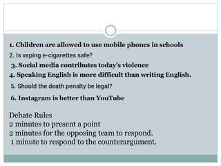 The document outlines a speaking assignment for students on various debate topics, including mobile phone use in schools and the safety of vaping. It specifies the structure for the debate, including time allocations for presenting points and responding. An outline in PowerPoint format is required, detailing team members and including sections for introduction, conclusion, and pros and cons.
