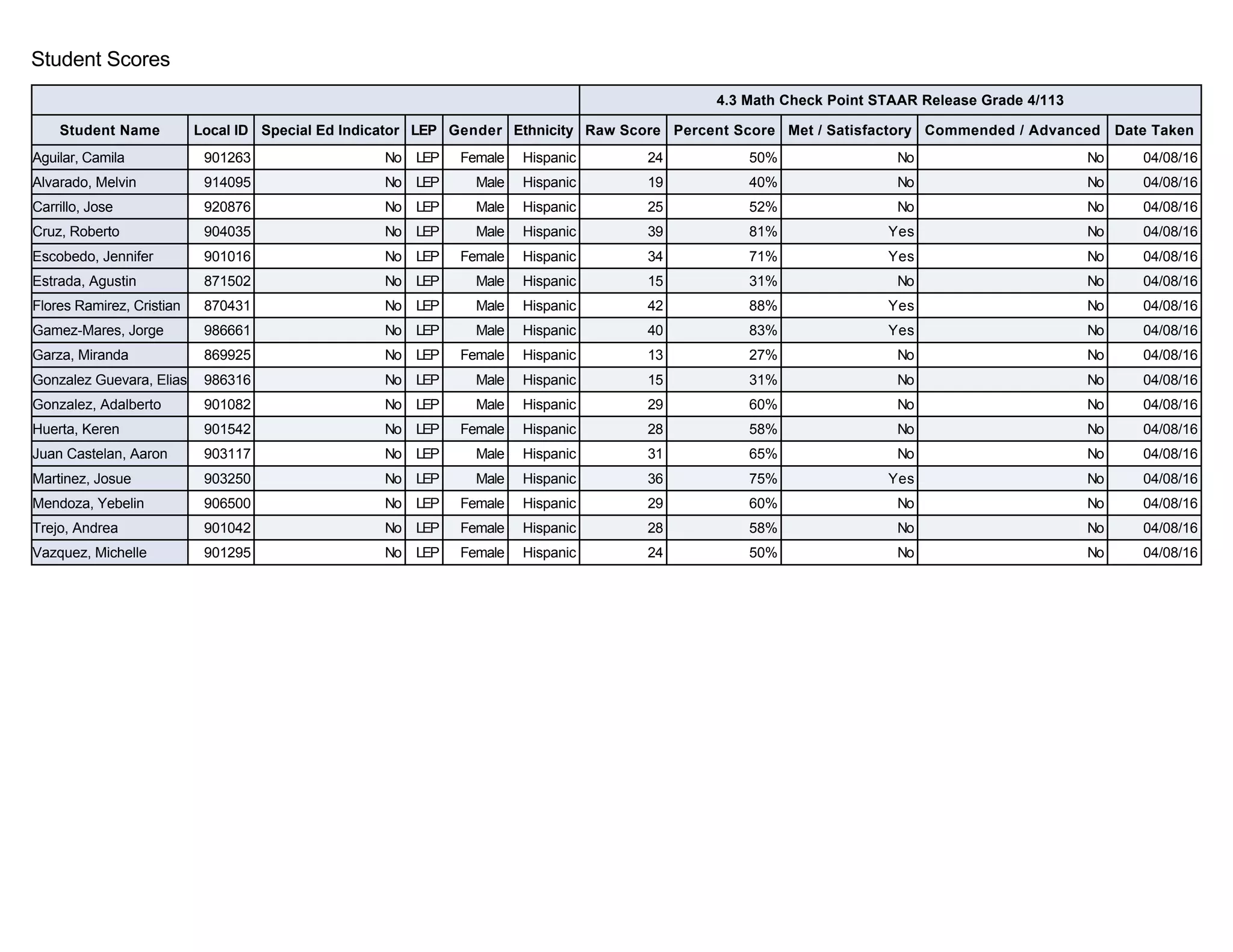 This document contains a summary of student scores on the 4th grade Math STAAR test. It lists each student's name, ID number, demographic information, raw score, percent score, and whether they met satisfactory or commended standards. Most students scored between 27-65% and met the satisfactory standard, while a few scored over 80% and met the commended standard.