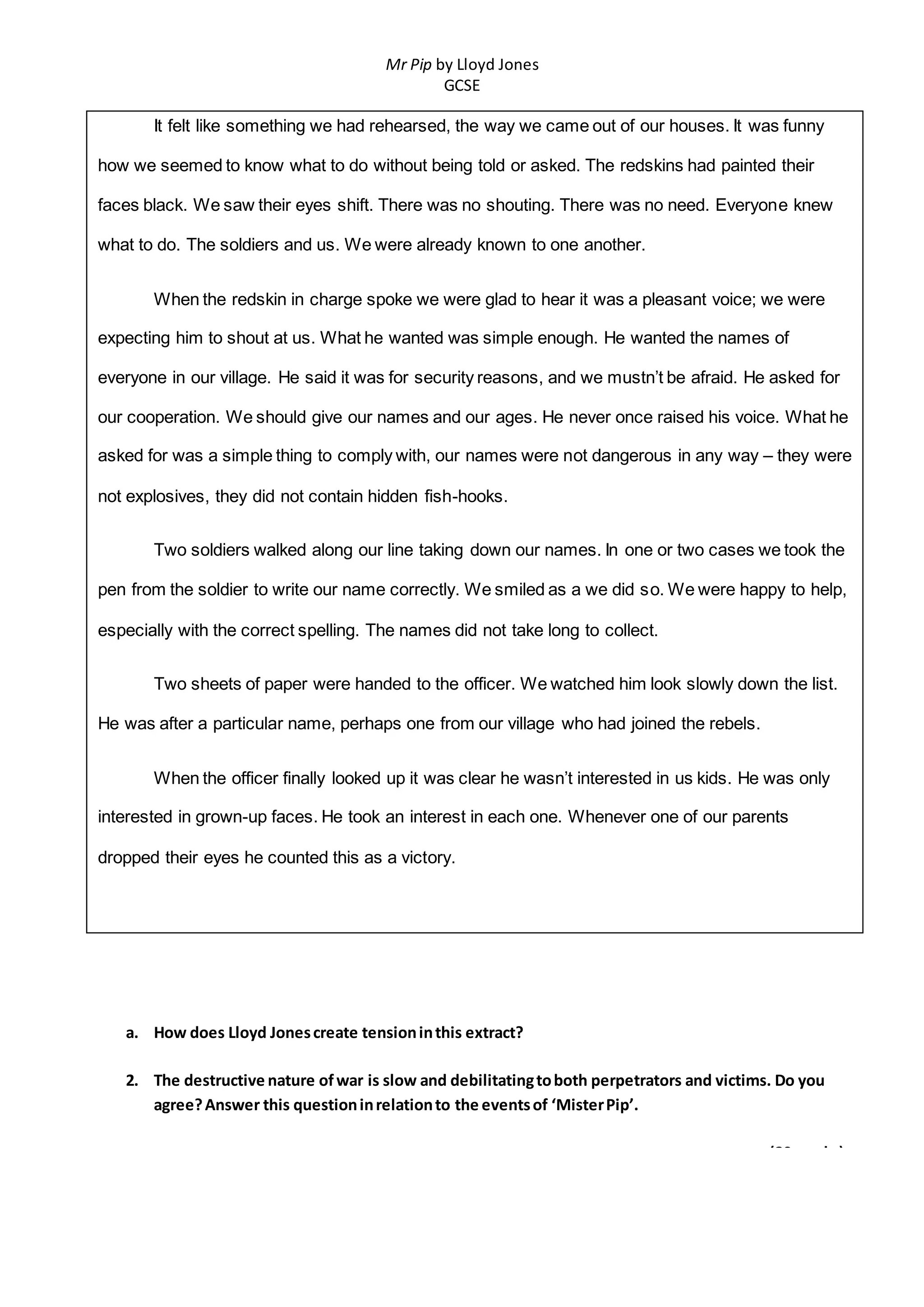The soldiers come to the village and take down the names of all the residents, ostensibly for security reasons. The villagers comply without protest, as the officer in charge speaks to them in a pleasant voice and asks for their cooperation. As the names are collected on two sheets of paper, the officer slowly reviews the list, looking for a particular name of someone who joined the rebels. It becomes clear he is only interested in the grown-ups, and sees it as a victory whenever one of the parents averts their eyes from his intense gaze.