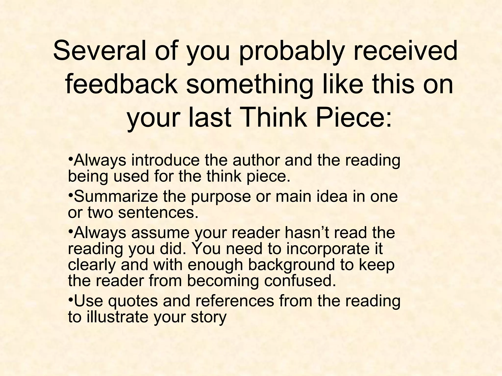 The document provides guidance on how to write a strong think piece by effectively incorporating a source text. It emphasizes introducing the author and reading, summarizing the main idea in 1-2 sentences, and assuming the reader is unfamiliar with the source. Quotes and references from the reading should be used to illustrate and support points. Examples are provided that skillfully introduce and incorporate a Frederick Douglass essay to reinforce ideas and experiences.