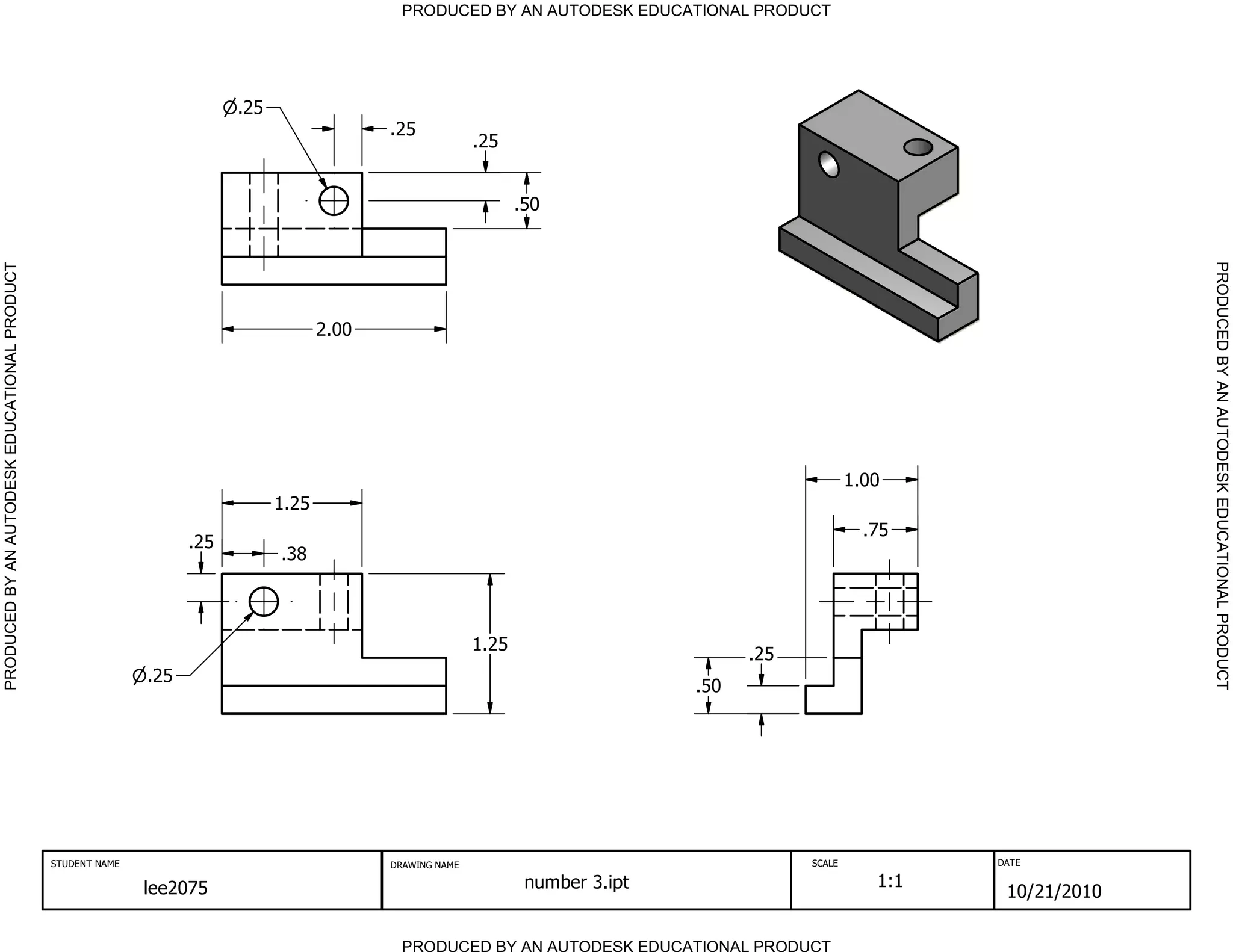 The document contains several technical drawings produced by an Autodesk educational product. Each page displays geometric shapes with numerical dimensions, and includes a student name, drawing name, scale, and date in the header. The drawings were created by a student named lee2075 between October 21-25, 2010 using Autodesk design software for educational purposes.