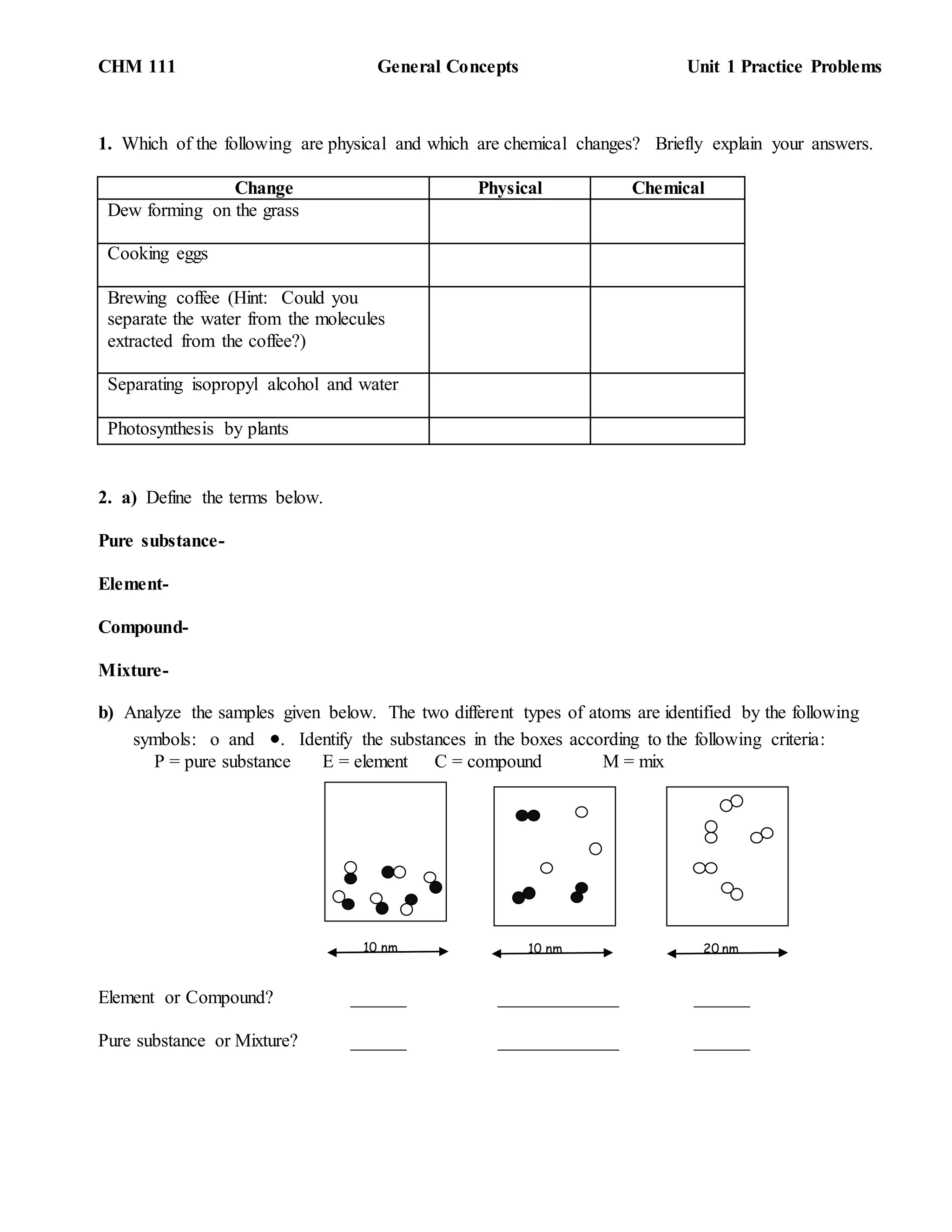 This document provides practice problems for a general chemistry unit covering concepts such as physical and chemical changes, pure substances and mixtures, separation techniques, properties, and density. It includes questions asking students to define terms, analyze samples, identify properties, describe separation methods, design experiments, and perform calculations.