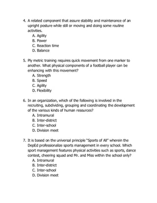 The document contains a 20-item practice test in LET MAPEH (Licensure Examination for Teachers - Major in Physical Education, Health and Music). The test covers various topics related to physical education, sports, and fitness including cardiovascular endurance activities, components of physical fitness, types of sports tournaments, skills in basketball and volleyball, and refereeing hand signals. It provides the questions, multiple choice answers, and an answer key at the end. There is also a background section that introduces the author as an experienced teacher and researcher with blogs on various topics.