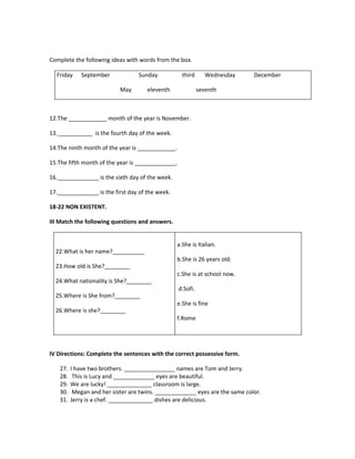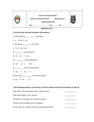 The document contains a practice test with multiple choice, fill-in-the-blank, and other grammar and vocabulary questions. It tests concepts like verbs, pronouns, possessives, interrogative forms, word forms, opposites, and more. The test has sections on grammar, vocabulary, and includes passages to fill in verbs and practice other grammar points. It is a practice exam to help students learn and test their English skills.