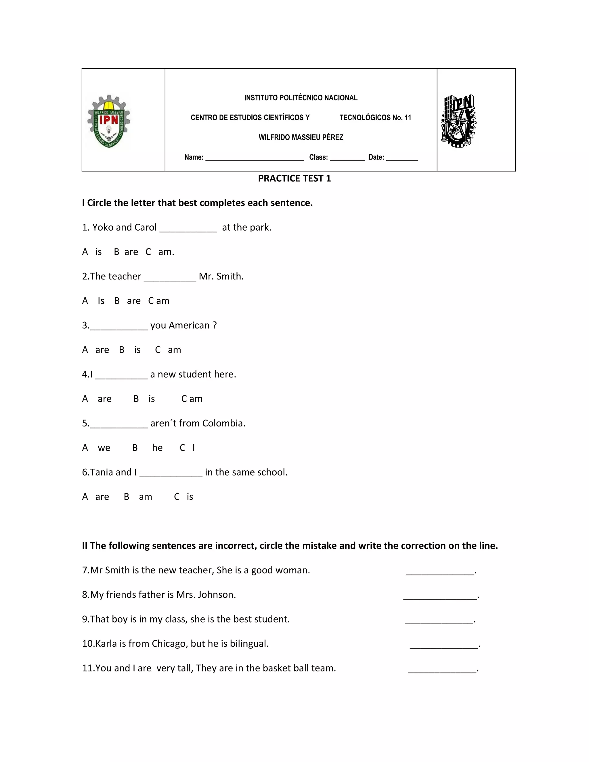 The document contains a practice test with multiple choice, fill-in-the-blank, and other grammar and vocabulary questions. It tests concepts like verbs, pronouns, possessives, interrogative forms, word forms, opposites, and more. The test has sections on grammar, vocabulary, and includes passages to fill in verbs and practice other grammar points. It is a practice exam to help students learn and test their English skills.
