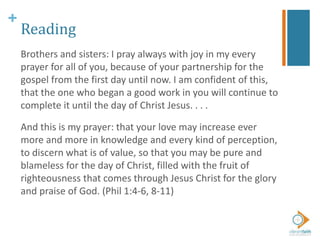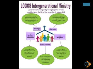 This document provides an overview of practices for intergenerational faith formation and ministry. It discusses five core practices: caring, celebrating, learning, praying, and serving. For each practice, it gives examples of how to implement intergenerational experiences and build relationships across generations. The document also discusses strategies for creating intergenerational experiences, infusing them into existing programs, and connecting generations. Finally, it explores opportunities for digitally connecting intergenerational faith formation between church experiences, daily life, and online resources.