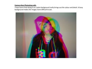 This document discusses techniques for practicing photography using a camera or phone app. It recommends taking photos on a plain background to better see colors and details, as a busy background can make images more difficult to see. The document also discusses using a phone app for practicing photography techniques.