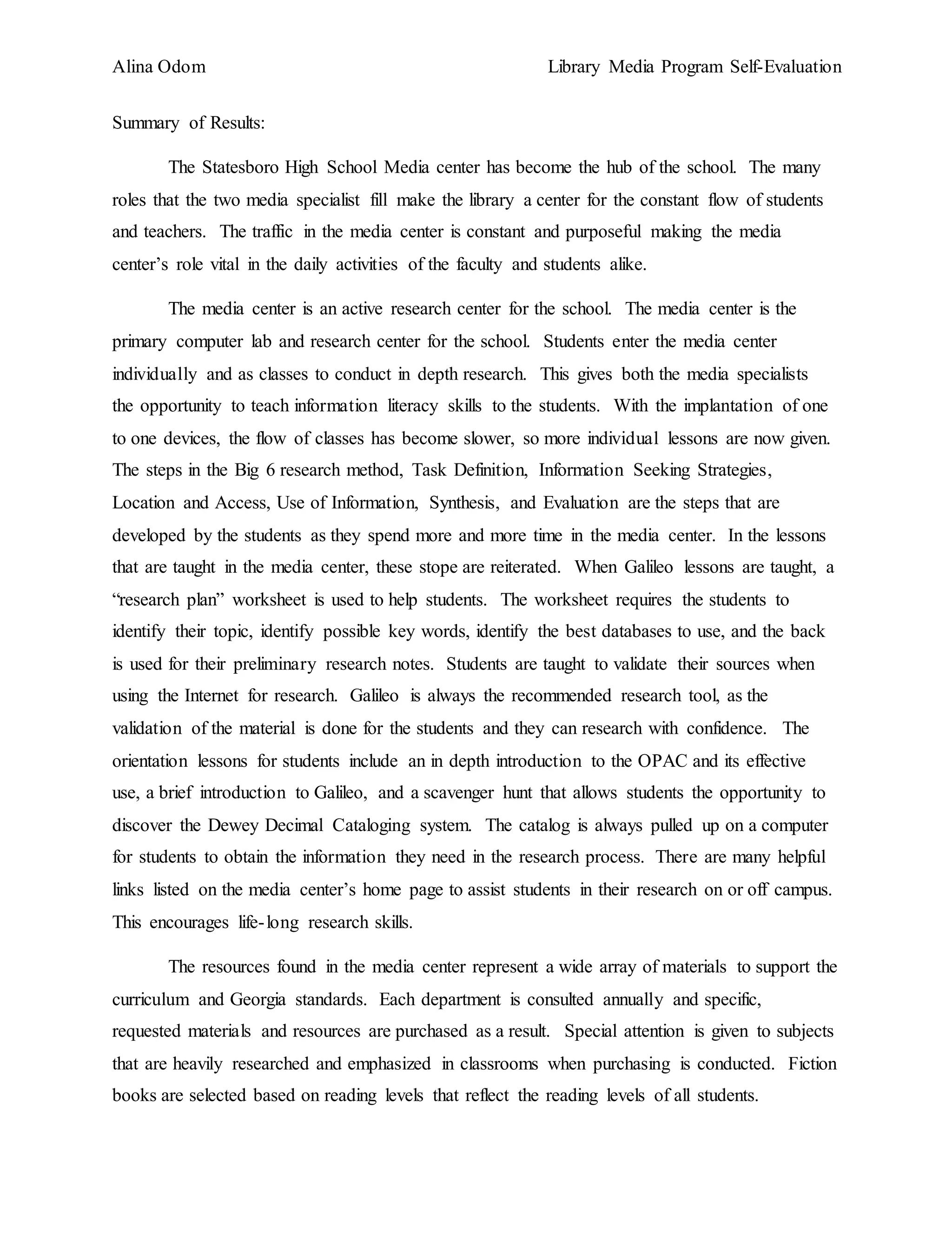 The document provides a self-evaluation of the media program at Statesboro High School. It describes how the media center is the hub of the school and is actively used for research, instruction, and collaboration between teachers and media specialists. Resources and technology available support all subject areas and student needs. Collaboration ensures information literacy skills are taught. Assessment of student achievement and using data to better meet diverse learning needs could be improved. Overall the program demonstrates support for students, teachers, and the community.
