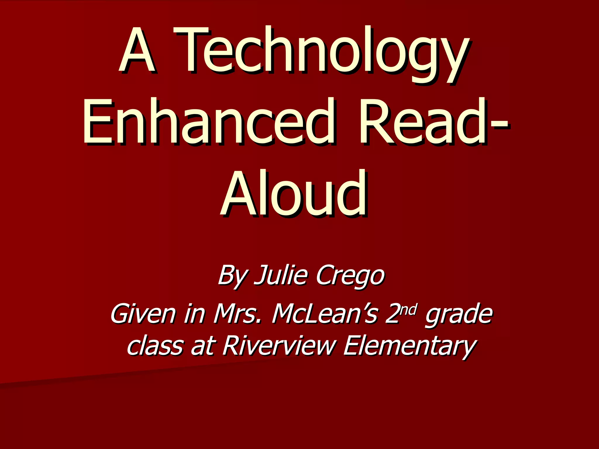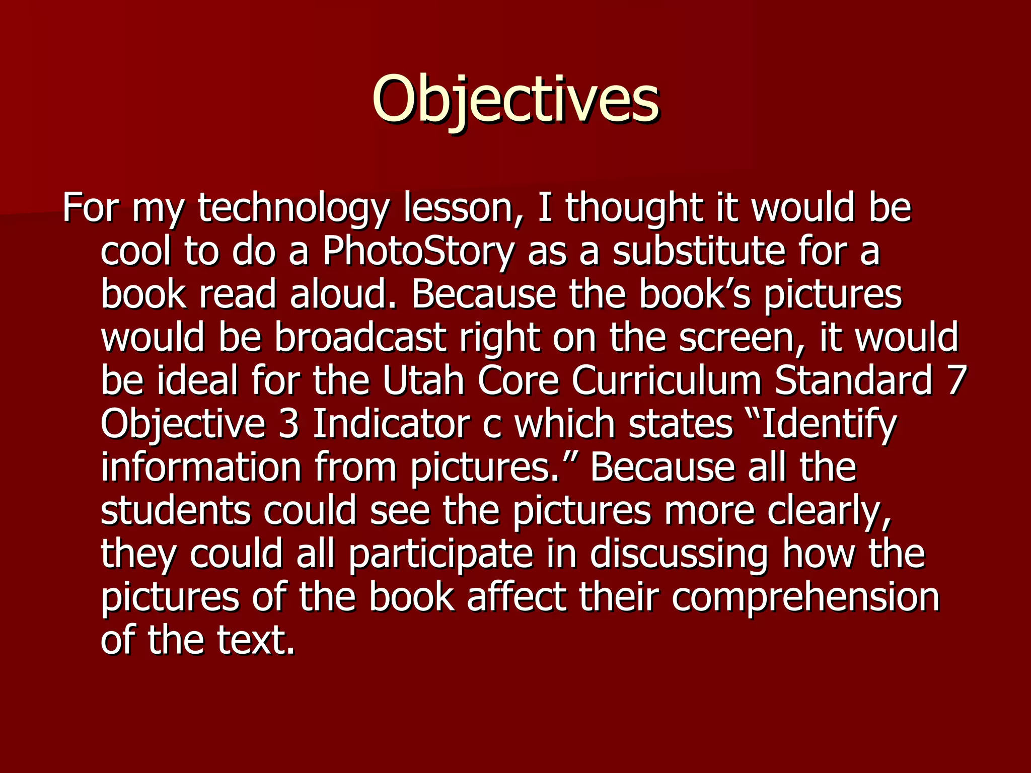 1. The teacher created a PhotoStory presentation to read the picture book "Heckedy Peg" aloud to the class, zooming in on key illustrations, in order to meet a state standard about identifying information from pictures.