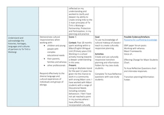 The document outlines a reflective review process aimed at improving teaching practice in relation to the principles of the Treaty of Waitangi and the needs of diverse learners in Aotearoa, New Zealand. It details personal contexts, learning goals, planned activities, and evidence for growth in areas like cultural responsiveness, professional learning, and inclusive education. The author aims to enhance their competency in te reo Māori, establish effective professional relationships, and improve communication skills to support the learning and wellbeing of all students.