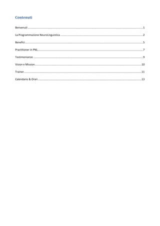 Il documento presenta un training certificato in programmazione neurolinguistica (PNL) a Milano, evidenziando i benefici e gli obiettivi del percorso, che mira a fornire competenze per affrontare le sfide della vita personale e professionale. Viene descritto l'approccio generativo, ecologico e significativo della PNL, insieme ai suoi principi e metodologie, sottolineando la personalizzazione del miglioramento individuale. Includendo testimonianze di partecipanti, il documento sottolinea come il corso possa portare a una trasformazione personale profonda e soddisfazione professionale.