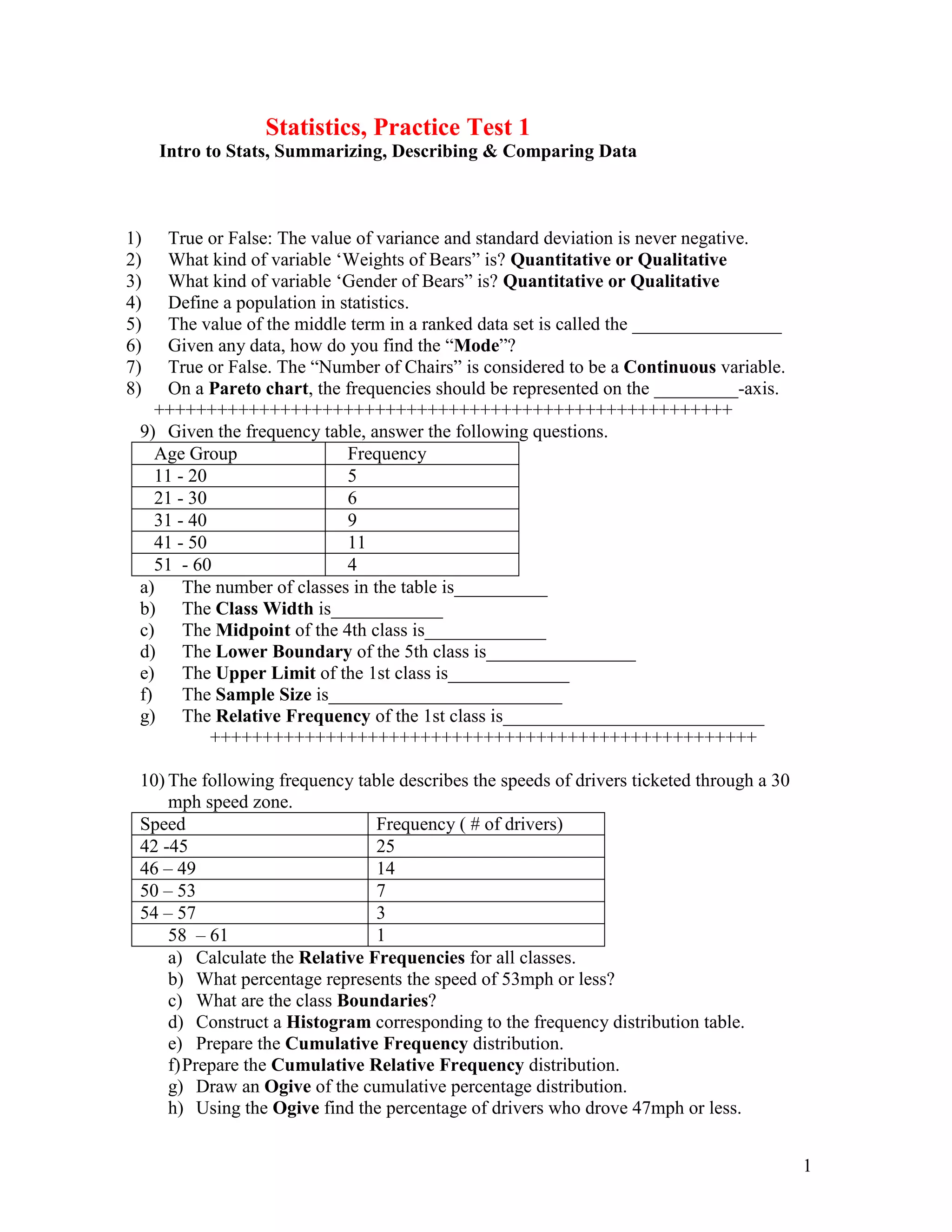 This document contains 26 multiple choice questions covering a variety of statistical concepts. These include questions about variables, measures of central tendency, percentiles, standard deviation, sampling, levels of measurement, and experimental design. The questions require calculating statistics like mean, median, mode, and standard deviation from data sets, interpreting graphs like histograms and box plots, and identifying properties of and relationships between statistical concepts.