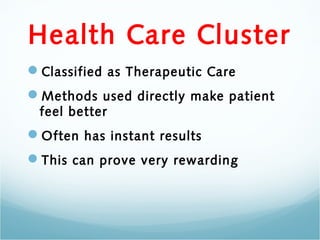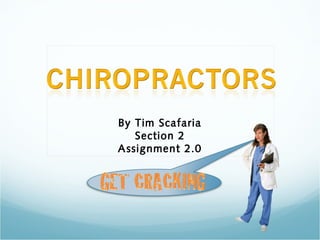 This document provides information about the career of a chiropractor. It discusses that chiropractors are classified as therapeutic care providers who use methods to directly make patients feel better, often with instant results. The document outlines that chiropractors treat problems with the muscular, nervous, and skeletal systems and that patients are often referred by general doctors for chronic ailments. It also summarizes that chiropractors take x-rays and diagnostic images to guide treatments and make recommendations about lifestyle changes.