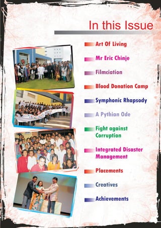 The document provides information about various events and achievements at Symbiosis International University. It mentions that Dr. S.B. Mujumdar was awarded the Pune Festival Award for his contributions to education. It also notes that Dr. Vidya Yeravdekar received the Pune's Pride Award 2011. Dr. Bhushan Patwardhan was appointed as the new Vice Chancellor of Symbiosis International University. Several induction programs, guest lectures, workshops, and a blood donation camp were also summarized in the document.