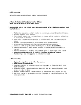 Pradeep Upadhyaya is a hard working and energetic manager with over 10 years of experience in sales and supply chain management. He has exceptional leadership skills and a focus on customer satisfaction. As the Sales Manager at Tata Steels, he was responsible for all marketing activities and successfully propelled the branch to lead revenue in the region. Pradeep has a proven track record of exceeding sales targets at previous roles with Infres Methodex Ltd and Eaton Power Quality Pvt. Ltd.