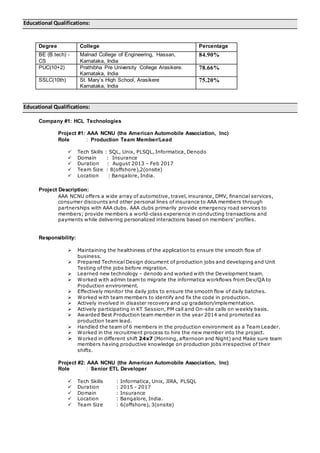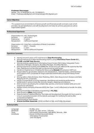 Pradeepa Dharmappa is an Oracle Certified Associate with over 5 years of experience in data warehousing using tools like Informatica PowerCenter, PL/SQL, and SAP BODS. She has worked as a Software Engineer at HCL Technologies and as a Senior Software Engineer at InterCall, where her responsibilities included ETL development, data integration, and supporting data applications. She is proficient in technologies like Oracle, SQL Server, UNIX, and has experience working with large datasets and complex data transformations.