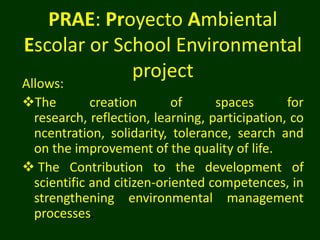 The School Environmental Project (PRAE) allows schools to create spaces for environmental learning, participation, and improving quality of life. The PRAE contributes to developing scientific and citizen-oriented skills to strengthen environmental management. The PRAE at Buckingham School focuses on conservation of nature with social responsibility through caring for oneself, others, and social responsibility. It implements a pilot resource management plan, with techniques for solid waste disposal, educational programs on environmental awareness, and involving outside groups.