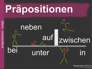 Il documento elenca diverse preposizioni di luogo in tedesco, come 'neben', 'auf', 'zwischen', 'bei', 'unter', 'in', 'an', e 'über'. Viene fatta anche menzione dell'uso di preposizioni nella formulazione di frasi relative a direzioni e posizioni, come 'nach hause' e 'zu hause'. L'argomento principale è quindi focalizzato sulle preposizioni di luogo necessarie per la comunicazione in tedesco.