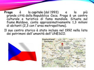 Praga è la capitale e la più grande città della Repubblica Ceca, con un centro storico riconosciuto dall'UNESCO. La città è attraversata dal fiume Moldava, che ha avuto un'importante influenza sulla sua storia e geografia, e presenta diverse attrazioni turistiche. La Repubblica Ceca confina con Germania, Austria, Slovacchia e Polonia, e utilizza la corona ceca come valuta ufficiale.