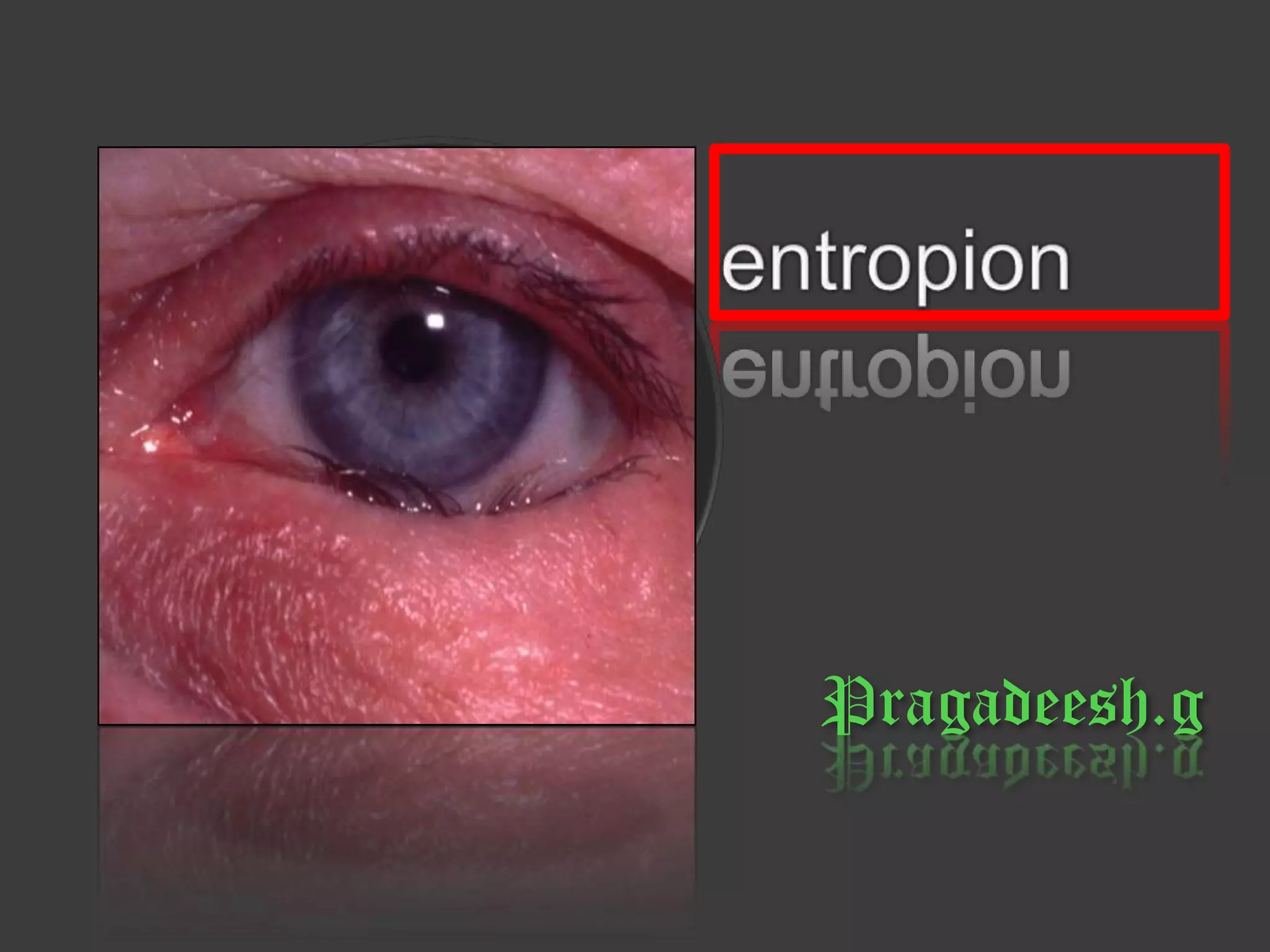 Entropion is a condition where the eyelid rolls inward towards the eye. It is caused by an imbalance between the muscles and tissues of the eyelid. There are several types of entropion, including involutional (age-related), cicatricial (scarring-related), spastic, and congenital. Symptoms include irritation, pain, foreign body sensation, and tearing. Signs include an inward rolling of the eyelid margin. Treatment depends on the type but may include lubricants, taping, botulinum toxin injections, or various surgical procedures to correct the underlying cause.