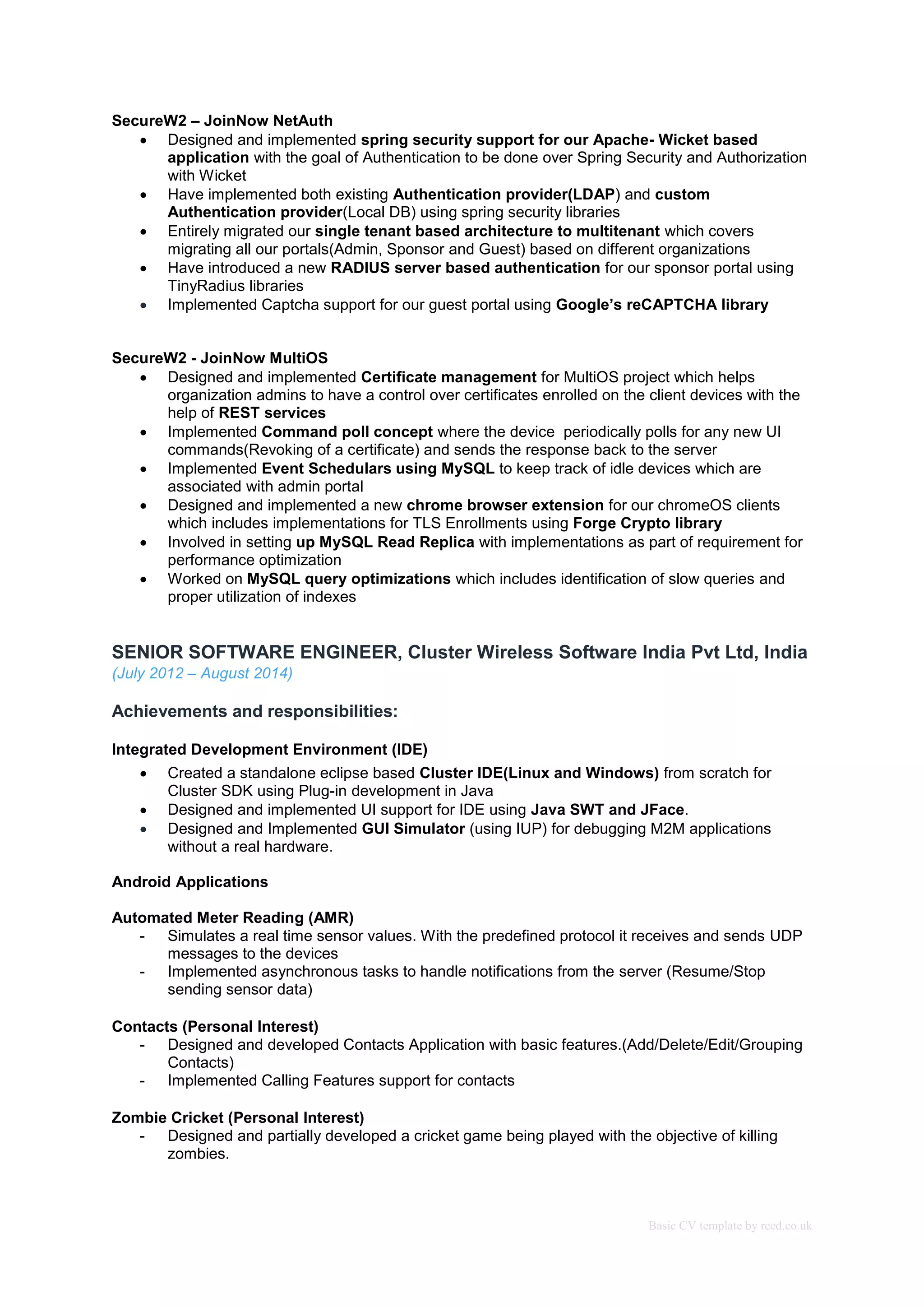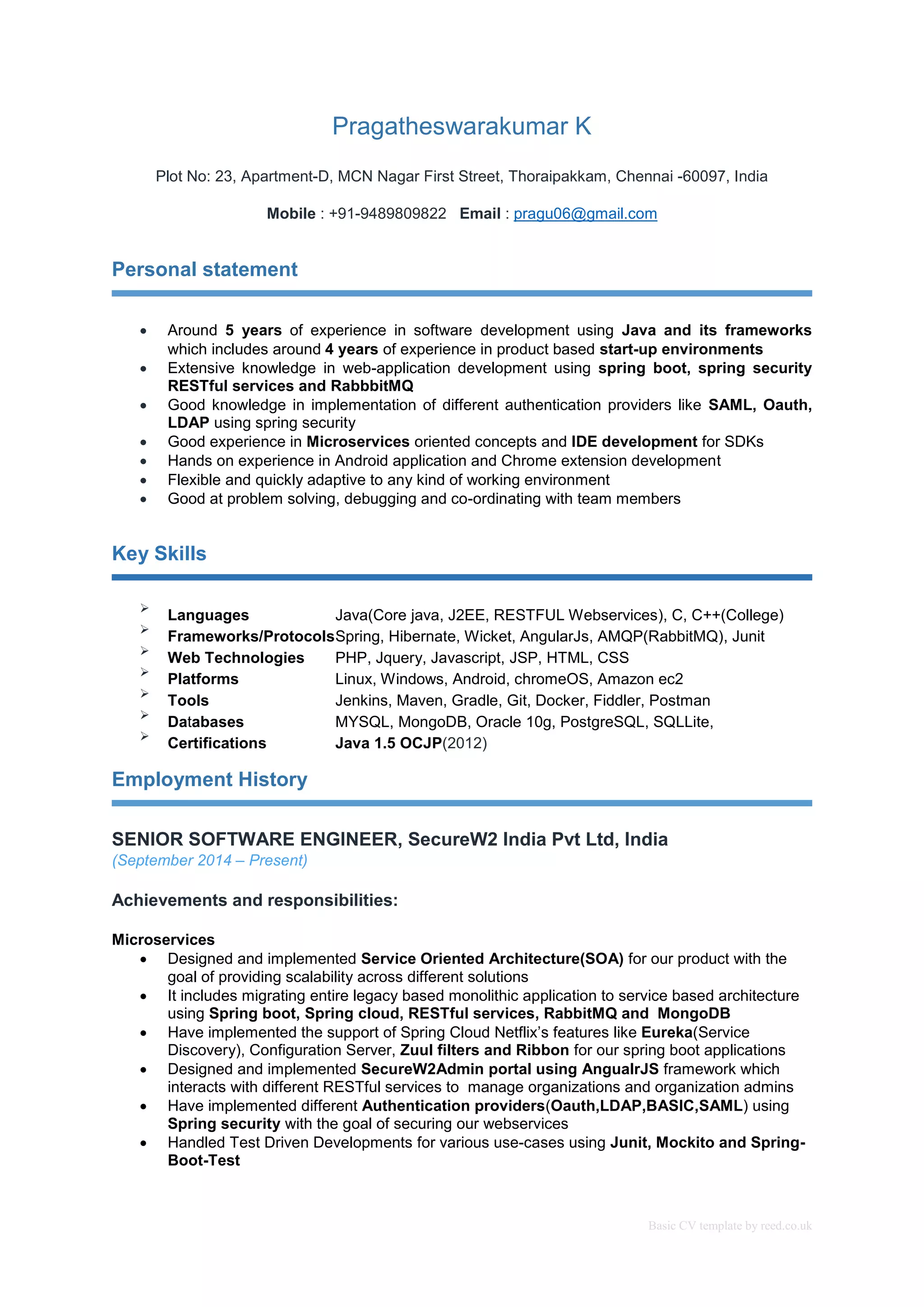 The document is a CV for Pragatheswarakumar K. It summarizes his professional experience including over 5 years of experience in software development using Java and related frameworks. It lists his skills in areas like Spring, AngularJS, RabbitMQ, Android development, and his past roles including senior software engineer roles at SecureW2 India Pvt Ltd and Cluster Wireless Software India Pvt Ltd developing microservices, web applications, and middleware. It also provides his educational qualifications and hobbies.
