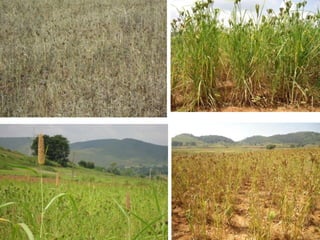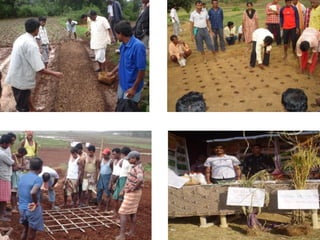 2) Crop cutting trials showed higher yields with SRI for various rice varieties compared to conventional methods. For example, one farmer yielded 19.3 quintals per acre with SRI compared to 13.6 quintals with conventional line sowing.