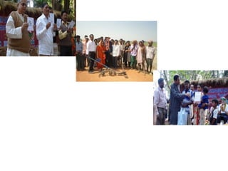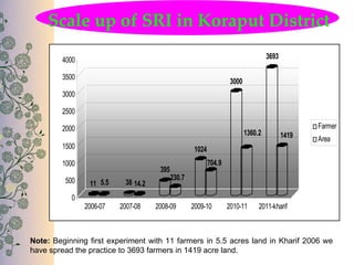 1) The document summarizes the scale up of the System of Rice Intensification (SRI) method in Koraput District, India over several years. It shows that SRI adoption has increased from 11 farmers using the method on 5.5 acres in 2006-2007 to 3,693 farmers using it on 1,419 acres in 2011.