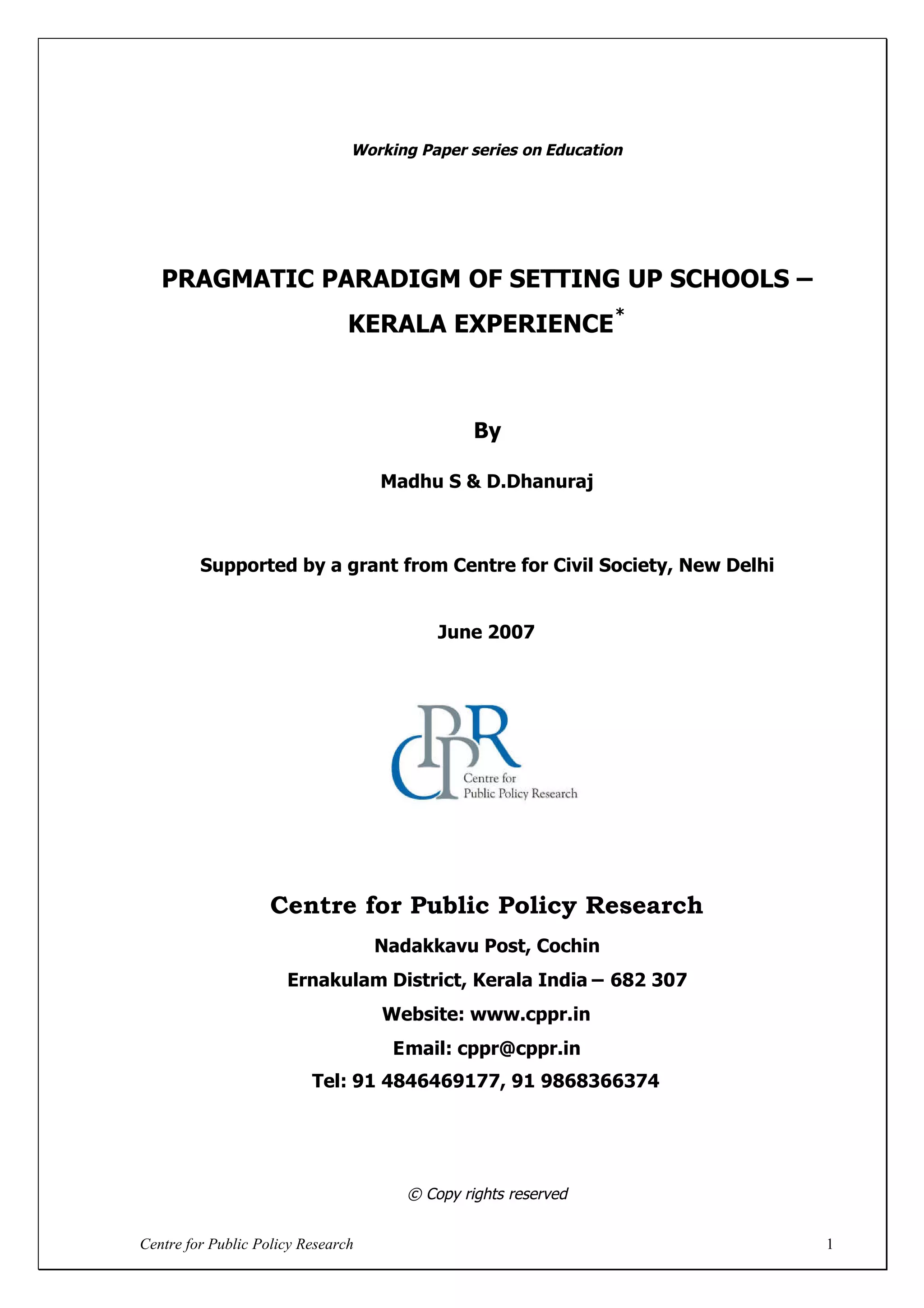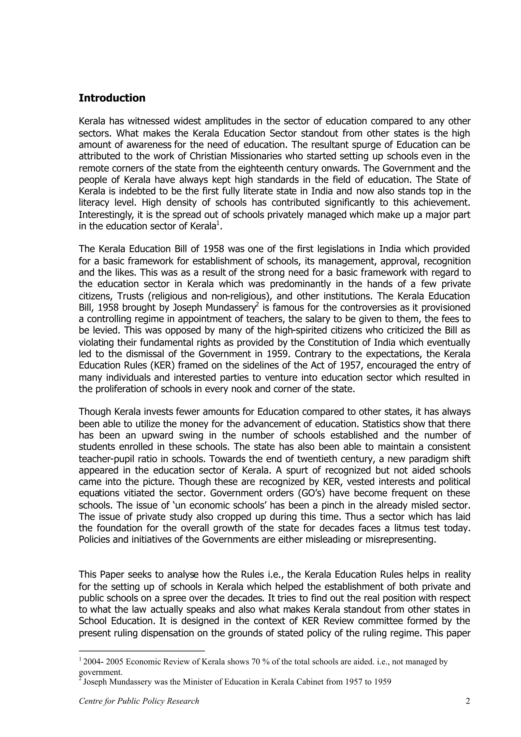 The document examines the educational landscape in Kerala, highlighting its unique awareness and historical contributions to education, particularly from Christian missionaries and subsequent government policies. It discusses the Kerala Education Bill of 1958, the establishment of schools, and the regulatory environment, which has evolved to manage both private and public educational institutions. Despite lower funding compared to other states, Kerala's education sector has thrived, but it now faces challenges such as unregulated schools and the need for policy reform to maintain quality education.