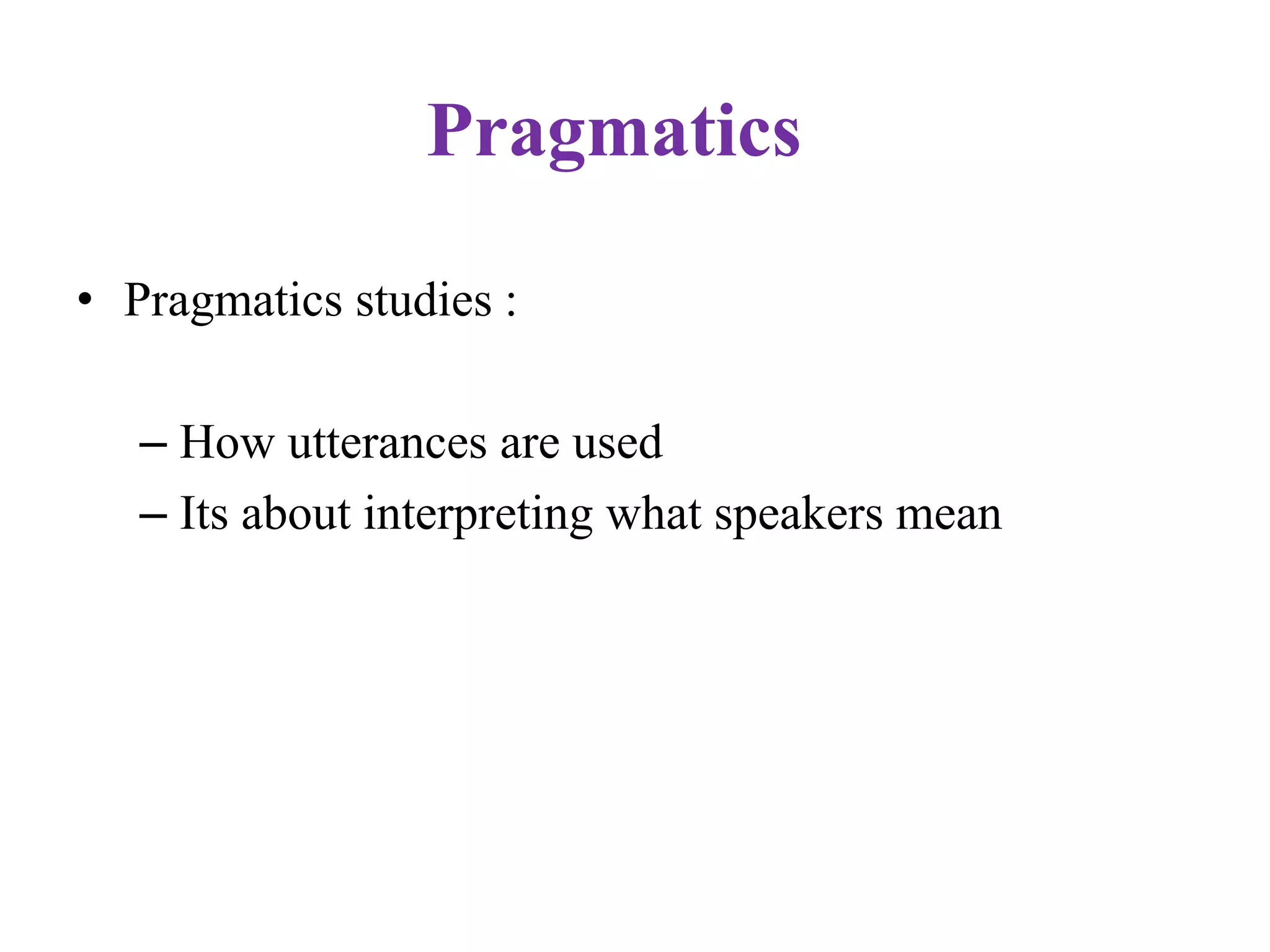 Pragmatics studies how utterances are used and interpreted based on context. It examines linguistic context like other words used, physical context like location, and how deixis requires shared knowledge. Speech act theory analyzes locutionary meaning, illocutionary intention, and perlocutionary effect. Cooperation theory proposes maxims for conversation like being relevant and clear. Pragmatic analysis considers how meaning relates to situation, people, context, and shared information.