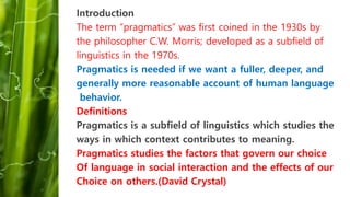 Pragmatics is a subfield of linguistics that studies how context contributes to meaning in human communication. It examines how language is used in social situations and how people make language choices based on their audience. Some key concepts in pragmatics include deixis, which uses expressions like pronouns to point to people, places, and things in context; reference and inference, which looks at how speakers choose referring expressions based on their assumptions of a listener's knowledge; and speech acts, which are the actions performed through utterances like apologies, requests, etc. Politeness is also an important aspect of pragmatics, as it examines how people maintain each other's public self-images and use face-saving language choices in