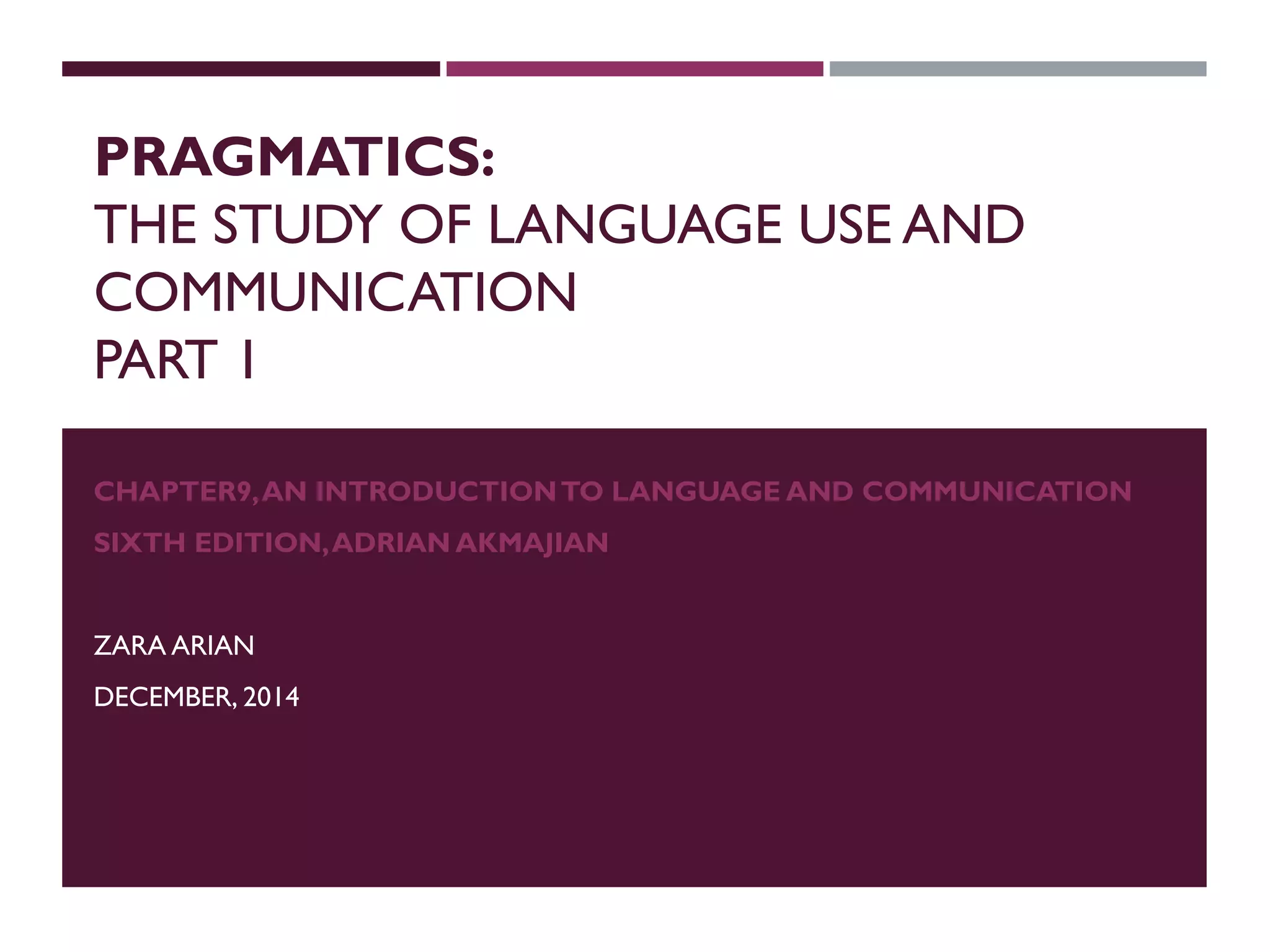 2) The inferential model, where communication relies on shared presumptions and inferential strategies. This model accounts for literal, nonliteral, and indirect language use through recognition of contextual appropriateness and inferences about the speaker's intention. Successful communication is recognizing the speaker's communicative intention.