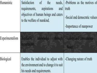 Pragmatism is a philosophy originating in the United States in the late 19th century that believes ideas and theories should be judged based on their practical consequences and real-world applications rather than on abstract principles. Key proponents included Charles Sanders Peirce, William James, and John Dewey. Pragmatism emphasizes practical application over theory, believing that what works in practice is more important than absolute truth. In education, pragmatism focuses on learning by doing through experience and projects rather than rote memorization, with the teacher acting as a guide or facilitator rather than an authority.