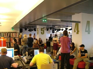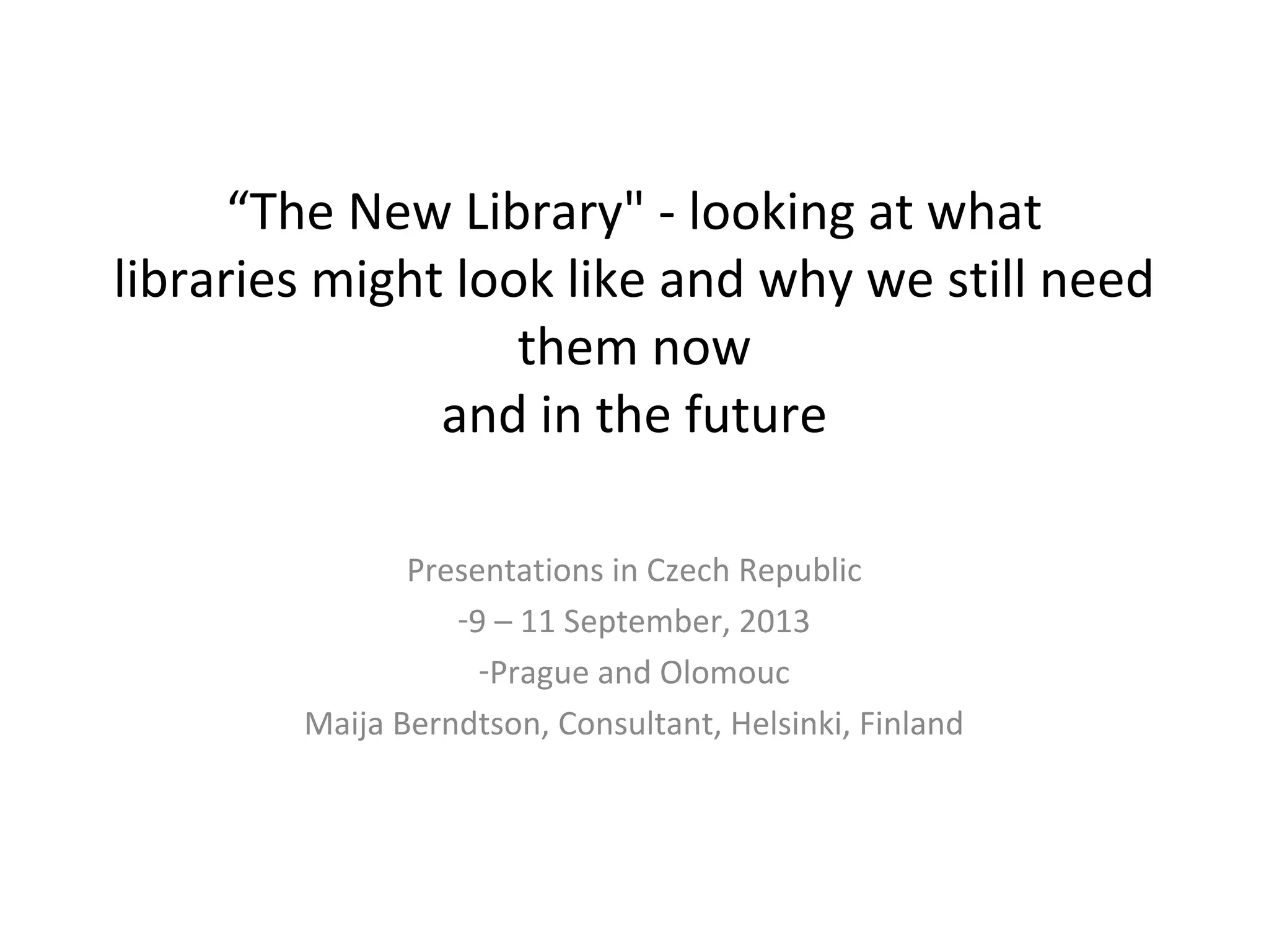 This document summarizes a presentation about the future of libraries. It discusses how libraries are changing and expanding their roles from traditional book lending to becoming community centers that provide learning resources, technology access, collaboration spaces, and cultural programming. It provides examples of new library services like laptop lending, 3D printing, and mobile apps. It also highlights strategies libraries are using to engage diverse groups and address issues like digital inclusion. Overall, the presentation envisions libraries transforming into vibrant public spaces and ecosystems that facilitate knowledge sharing, community building, and lifelong learning.