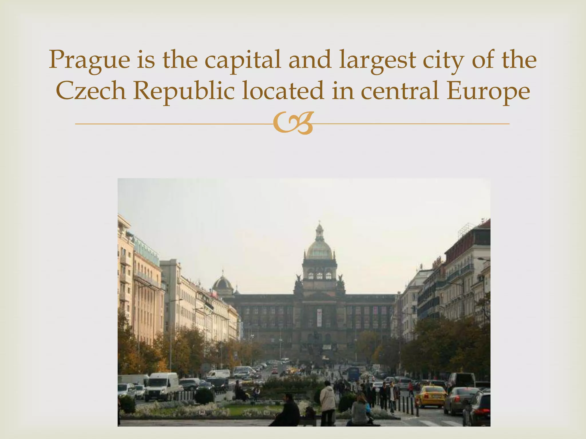 Prague is the capital and largest city of the Czech Republic, located in central Europe. Politically, the Czech Republic is a multi-party parliamentary representative democratic republic, with a president as head of state and a prime minister as head of government. Prague has a population of over 1.2 million and accounts for 25% of the country's GDP. The city is known for its ancient buildings and creative architecture, including landmarks like the Astronomical Clock from 1410 and Charles Bridge crossing the Vltava River.