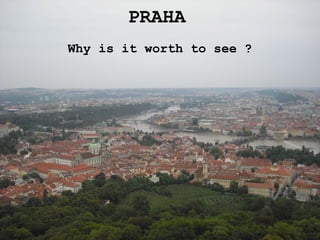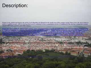 Prague is the capital and largest city of the Czech Republic, located on the Vltava River. For over 1,100 years, Prague has been an important political, cultural, and economic center of Europe. The city is home to many famous historical sites that survived both World Wars and the Communist era, including Prague Castle, the Charles Bridge, and Old Town Square. Prague receives over 4 million international visitors annually, making it a popular tourist destination known for its rich history, architecture, and museums.