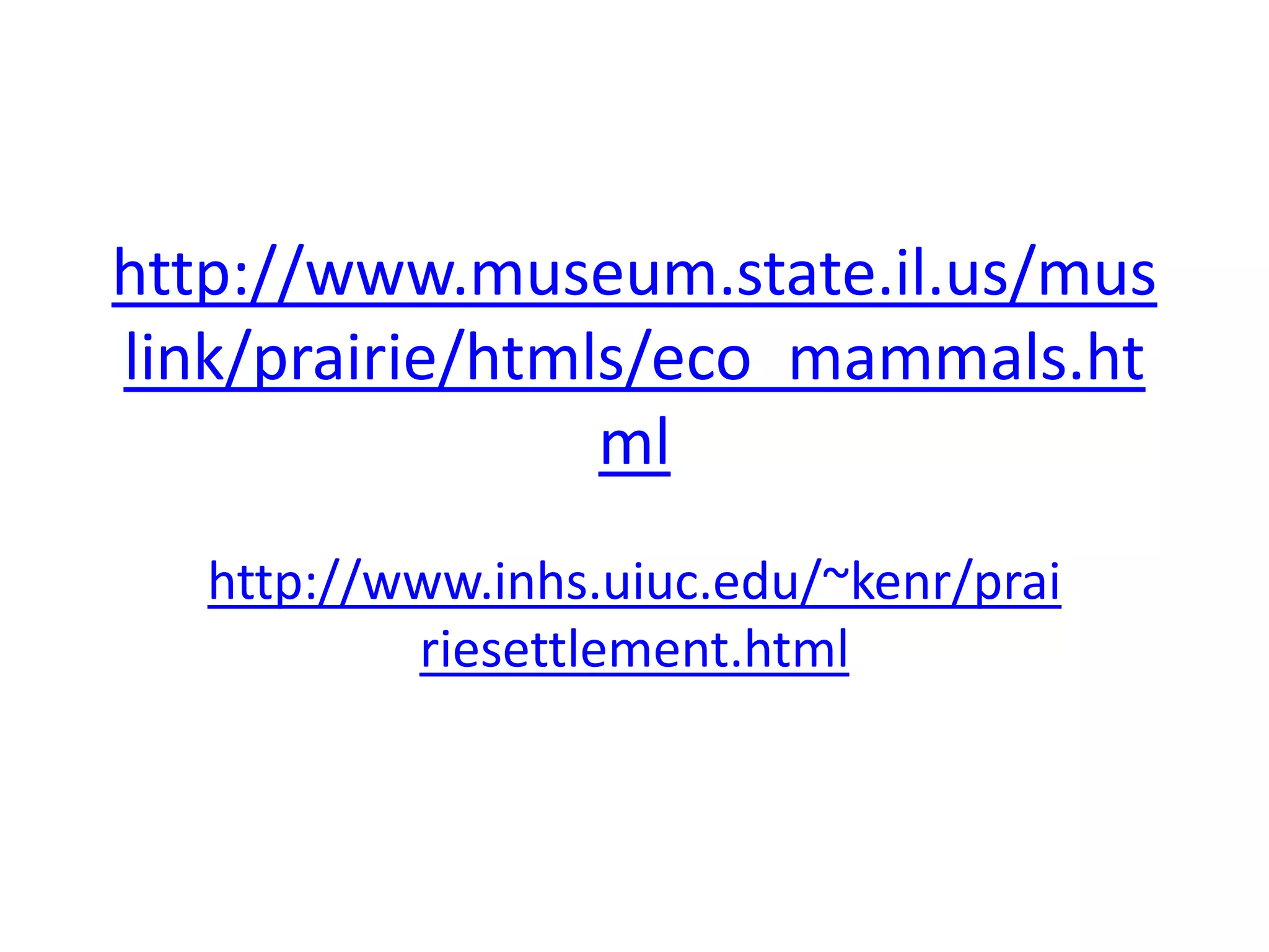 The prairie ecosystem of Illinois once supported a diversity of mammal species including bison, elk, wolves and prairie dogs. European settlement of the prairies starting in the early 1800s led to the destruction of prairie habitat and the near elimination of large mammal species. Today conservation efforts focus on restoring prairie lands and reintroducing some mammal populations.