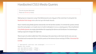 The document discusses responsive web design, which involves designing websites to adapt to different screen sizes and devices. It covers key aspects of responsive design like flexible grid layouts, flexible images and media, and media queries. Responsive design helps ensure websites are usable on a variety of devices and future-proofs sites as technology changes.