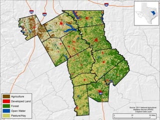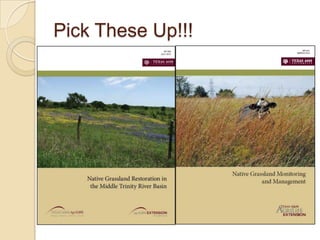 This document provides information on prairie restoration in Texas. It discusses that native prairie once covered 75% of Texas but now less than 1% remains. It describes key native grasses and forbs used in restorations and their importance for wildlife habitat, livestock forage, and watershed protection. The restoration process involves establishing goals, selecting an appropriate site, preparing the site, establishing native plants, and long-term monitoring to evaluate the restoration success.